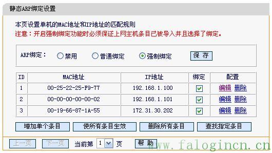 可以看到狀態中已經為已綁定,這時候,路由器已經具備了防止ARP欺騙的功能,上面的示范中只有一個條目,如果您的電腦多,操作過程也是類似的。有些條目如果沒有添加,也可以下次補充上去。除了這種利用動態學習到的ARP表來導入外,也可以使用手工添加的方式,只要知道電腦的MAC地址,手工添加相應條目就可。