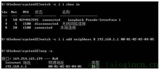 3、執行綁定:netsh -c i i add neighbors "網絡連接名稱" "IP地址" "MAC地址"。