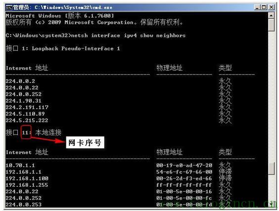 2、用 netsh interface ipv4 show neighbors 查看網卡序號。