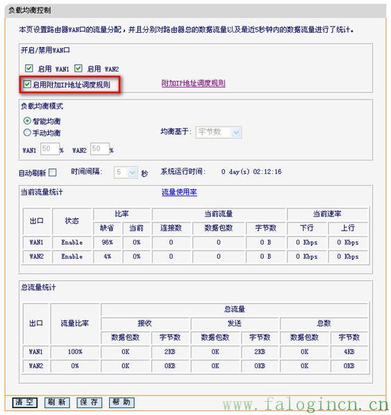 (1) 網絡參數>>負載均衡控制頁面,啟用WAN1,啟用WAN2,并且”啟用附加IP地址調度規則”: