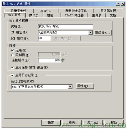 在“默認Web站點”上按鼠標右鍵,選擇“屬性”,彈出默認Web站點設置窗口: