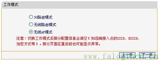 步驟4:點擊“下一步”開始設置,彈出工作模式設置頁面,選擇“無線AP模式”如下圖所示。