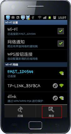STEP1:手機無線連接上無線路由器之后,按鍵“MENU”菜單鍵,彈出“高級”按鈕。點擊“高級’,彈出手機IP地址配置頁面。