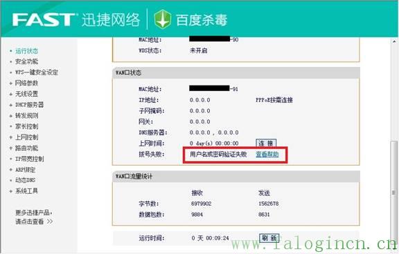 (注意:如果在寬帶接入(PPPOE)模式的情況下,“WAN口狀態”中IP地址仍然是0.0.0.0,可以參考撥號失敗中的內容,如下圖所示。點擊“查看幫助”根據提示做相應的檢查。)