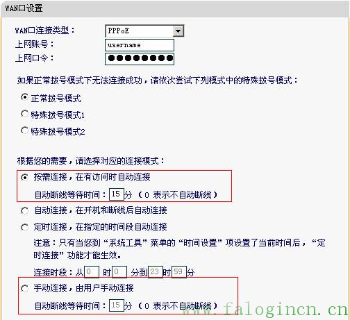 該方式下,路由器不會自動進行PPPOE撥號,當網絡中有數據要與外網進行通信時,路由器才會進行PPPOE撥號。對于按時間上網收費的用戶,可以使用該上網方式。設置自動斷線時間,在該時間內,若沒有數據與外網通信,路由器會進行斷開PPPOE連接。