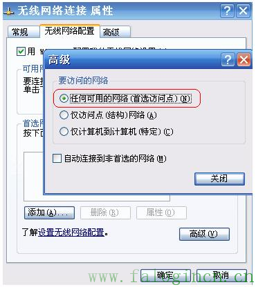 3. “無線網絡配置”中點擊“高級”,選擇“任何可用的網絡(首選訪問點)”如下圖。