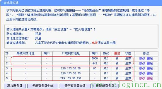 有些用戶會擔(dān)心,“IP地址過濾”規(guī)則的可設(shè)定條目數(shù)是有限的,可設(shè)定條目數(shù)不夠怎么辦?不用擔(dān)心,因為我司的寬帶路由器“IP地址過濾”條目在設(shè)置的時候,“局域網(wǎng)IP地址/廣域網(wǎng)IP地址”這兩個參數(shù)都是可以輸入一段IP地址的,比如我們上面發(fā)現(xiàn)的四個服務(wù)器IP地址可以合并為下面的兩個條目: