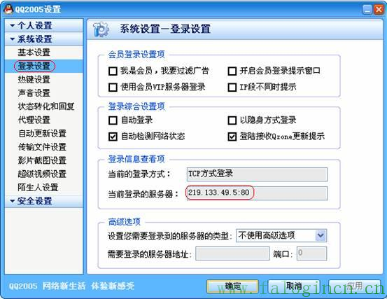 試驗中找到的三個服務(wù)器的IP地址(219.133.38.29、219.133.38.30、219.133.38.232)都被封鎖了,但是QQ2005又一次成功登錄,于是繼續(xù)打開QQ2005的“登錄設(shè)置”頁面如下圖: