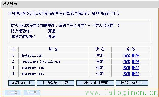 上面的設置要求路由器的防火墻功能是啟用的,即在管理界面的“安全設置”->“防火墻設置”中保證“開啟防火墻”和“開啟域名過濾”都打上勾并保存,如下所示: