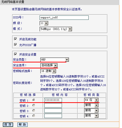 “密鑰選擇”填入“密鑰1”的位置,密鑰類型選擇64/128/152位,選擇了對應的位數以后“密鑰類型”的長度會變更,本例中我們填入了10位參數1111111111 。因為“密鑰格式選擇”為“16進制”,所以“密鑰內容”可以填入字符是0、1、2、3、4、5、6、7、8、9、a、b、c、d、e、f,設置完記得保存。
