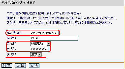 “類型”可以選擇“允許”/“禁止”/“64位密鑰”/“128位密鑰”/“152位密鑰” ,本例中選擇了64位密鑰。“允許”和“禁止”只是簡單允許或禁止某一個MAC地址的通過,這和之前的MAC地址功能是一樣的,這里不作為重點。