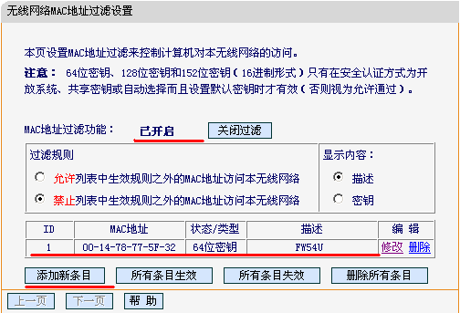 打開“無線設置”->“MAC地址過濾”,在“MAC地址過濾”頁面“添加新條目”,如下界面是填入參數的界面: