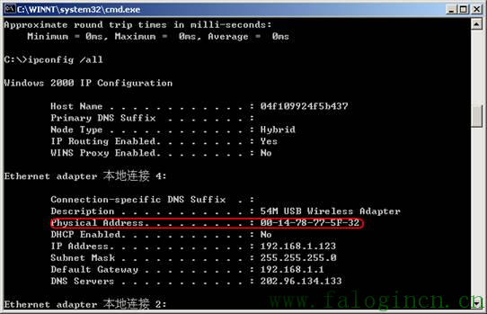 順便說一下怎樣獲取網卡MAC地址?可以參考我司網站“網絡教室” 文檔《路由器配置指南》相關內容,通過電腦DOS界面運行ipconfig/all這個命令會彈出如下類似信息,紅線勾勒部分“Physical Address”對應的就是處于連接狀態的網卡的MAC地址;