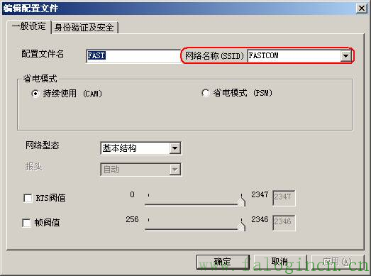 打開FW54U客戶端應用程序主界面——“配置文件”—>“編輯”,會彈出用戶配置文件管理對話框。首先是“常規”頁填入和無線路由器端相同的SSID —— 本例為“FASTCOM” ,如下圖所示:
