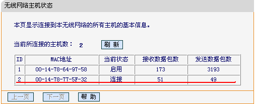 這時候我們進入路由器“無線參數”-“主機狀態”,可以看到已連接的網卡MAC地址;在“主機狀態”頁面,表里第一個顯示的是無線路由器的MAC地址;下面的就是已經連接到無線網卡的MAC地址。